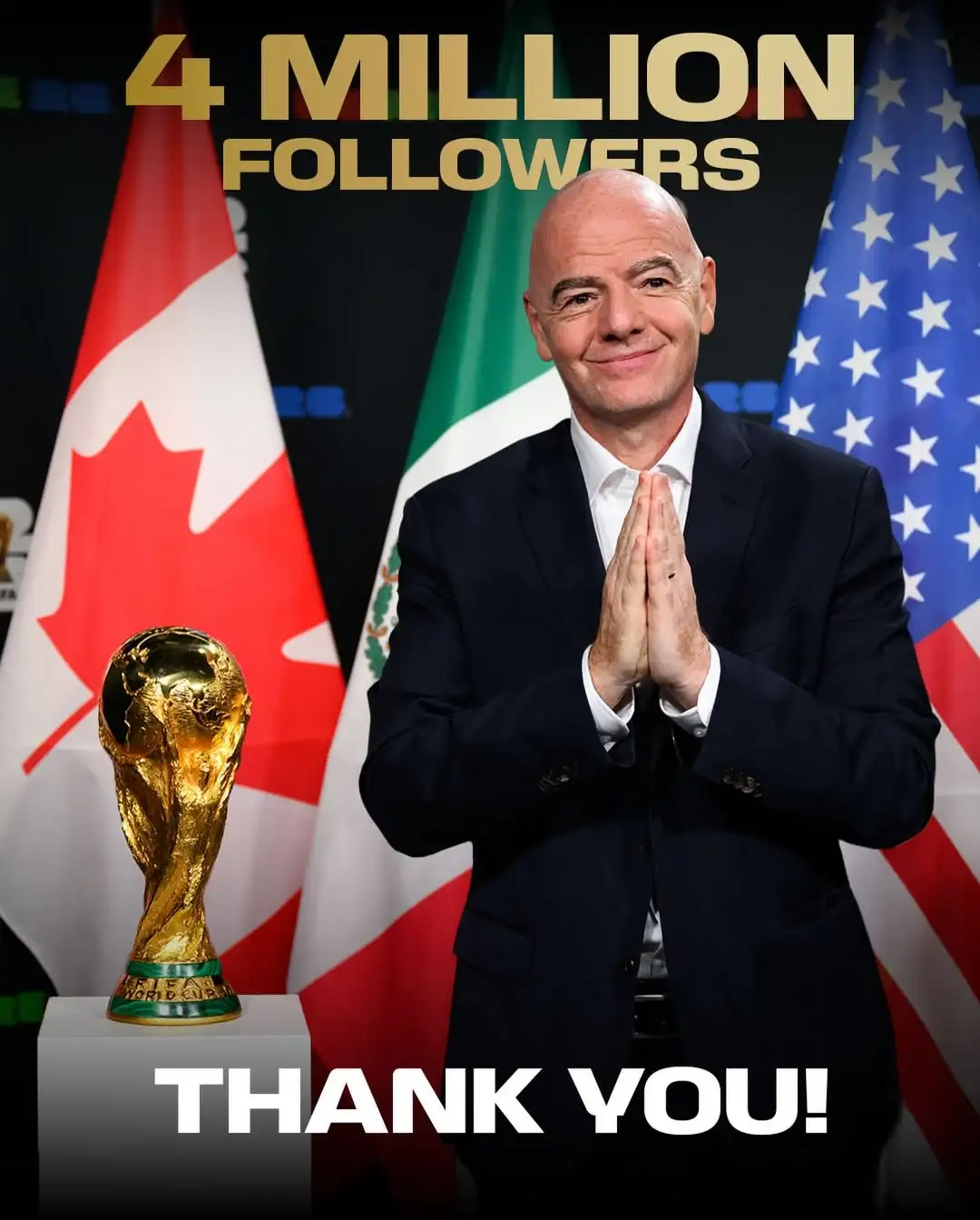 虎扑03月05日讯 国际足联主席因凡蒂诺在社交媒体上迎来了400万粉丝的里程碑。他发文表达了对粉丝的感激之情: