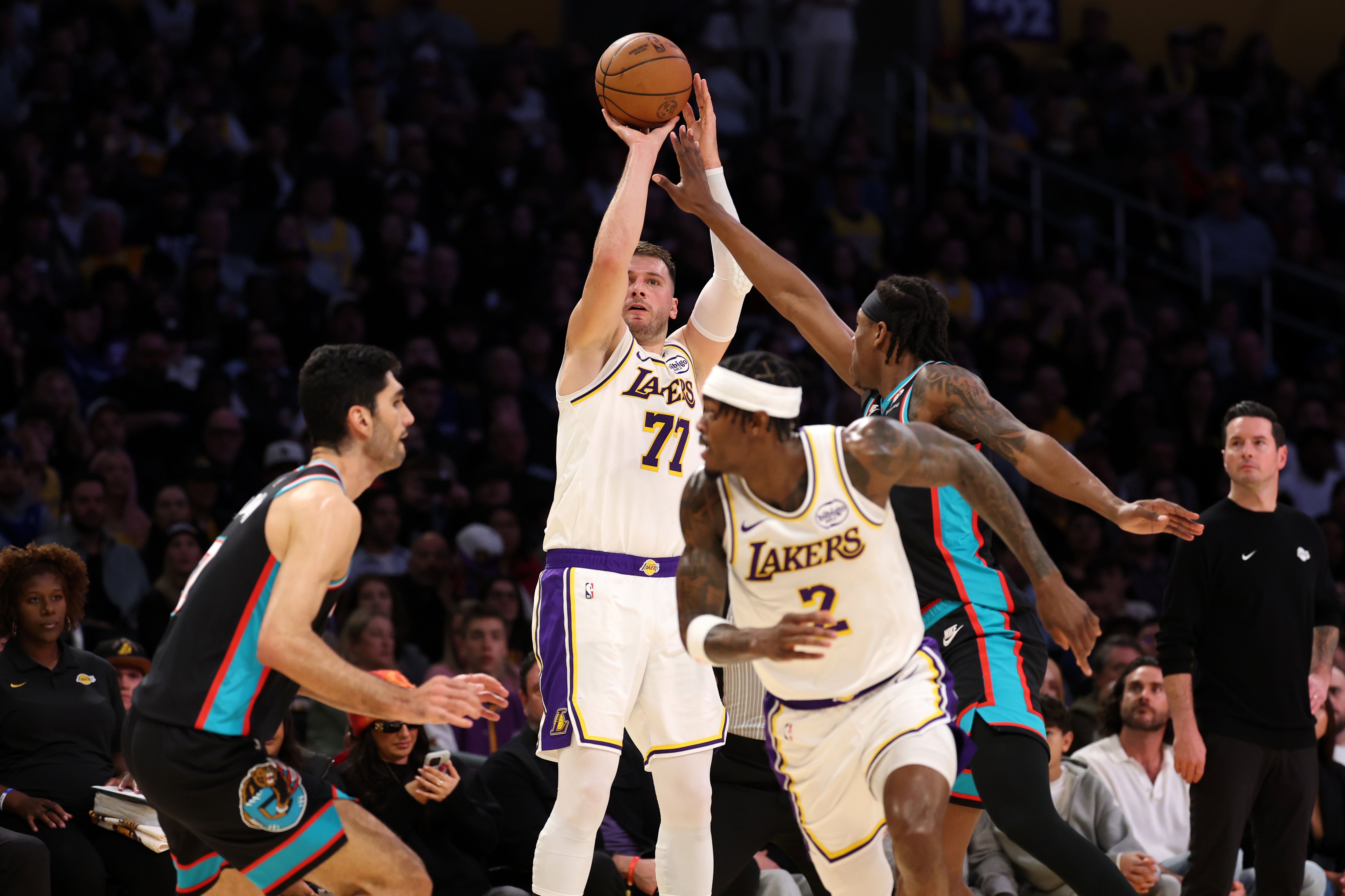 东契奇吸引夹击,艾顿顺下被严防死守,射手群大空位三分集体失准,湖人早早就落后两位数。